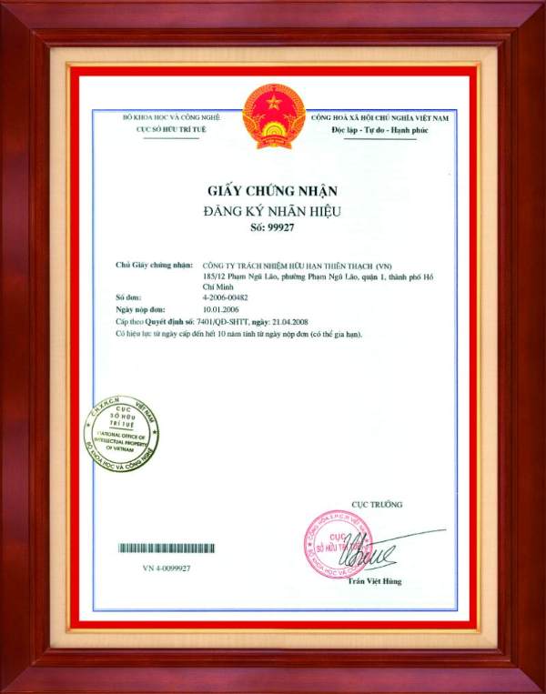 Năm 2008, thương hiệu THIÊN THẠCH đã được đăng ký chứng nhận nhãn hiệu hàng hóa và chính thức được công nhận số: 099927 theo Quyết định số: 7401/QĐ-SHTT do Cục Sở Hữu Công Nghiệp – Bộ Khoa Học Công Nghệ và Môi Trường cấp ngày 24/04/2008 và Số: 130809 theo QĐ số: 16495/QĐ-SHTT cấp ngày 31/07/2008.